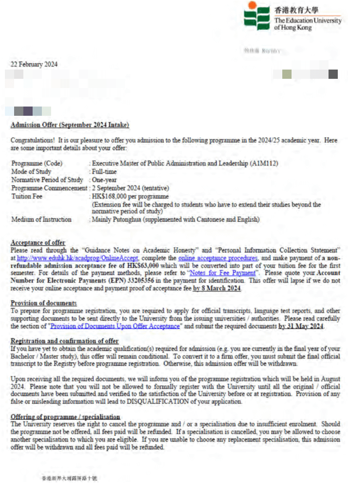 最终,甘女士在2024年2月成功收到香港教育大学公共管理与领导行政硕士的录取结果!审理周期仅2个月。
